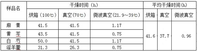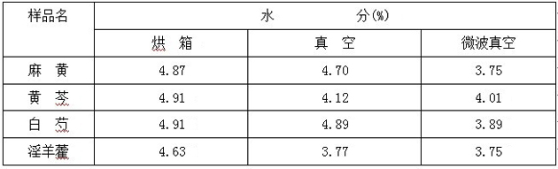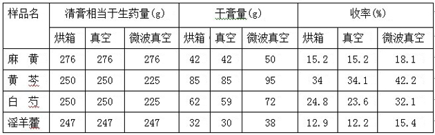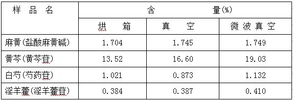 干燥技術(shù)是中成藥生產(chǎn)過程中的重要工藝過程之一,隨著對干燥特性認(rèn)識的進一步深化,不同干燥方法以及不同干燥溫度對藥品質(zhì)量影響受到廣泛關(guān)注。為了驗證烘箱干燥,真空干燥和微波真空干燥不同的特性及各干燥方法對中藥提取物干燥行為的結(jié)果,本實驗對4種中藥浸膏的干燥方法進行了對比實驗,研究了不同干燥方法對中藥中有效成份含量的影響,以期為選擇中藥浸膏干燥方法提供科學(xué)依據(jù)。