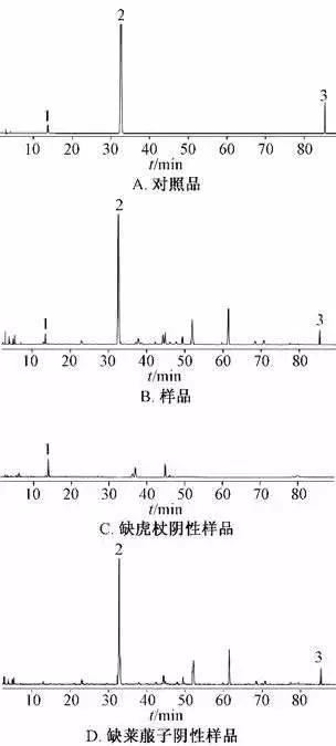 由圖可知, 樣品溶液與對(duì)照品在相應(yīng)位置上有相同保留時(shí)間色譜峰, 陰性無(wú)干擾