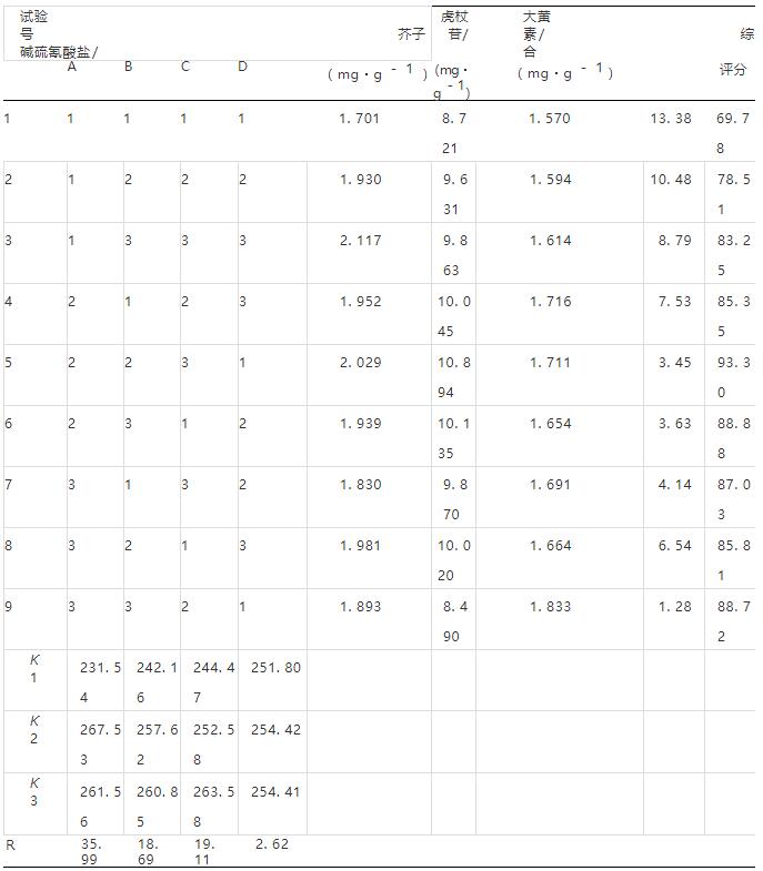 2.5 正交試驗(yàn) 選擇芥子堿硫氰酸鹽、虎杖苷、大黃素含有量及含水量作為評(píng)價(jià)指標(biāo),采用綜合加 權(quán)評(píng)分法進(jìn)行處理,根據(jù)肝寶膠囊君臣佐使組方原 則,設(shè)定綜合評(píng)分=虎杖苷含有量/最高含有量× 0.35 ×100+大黃素含有量/最高含有量×0.3× 100+芥子堿硫氰酸鹽含有量/最高含有量×0.2×100+ (1-含水量/最高含水量) × 0. 15 ×100